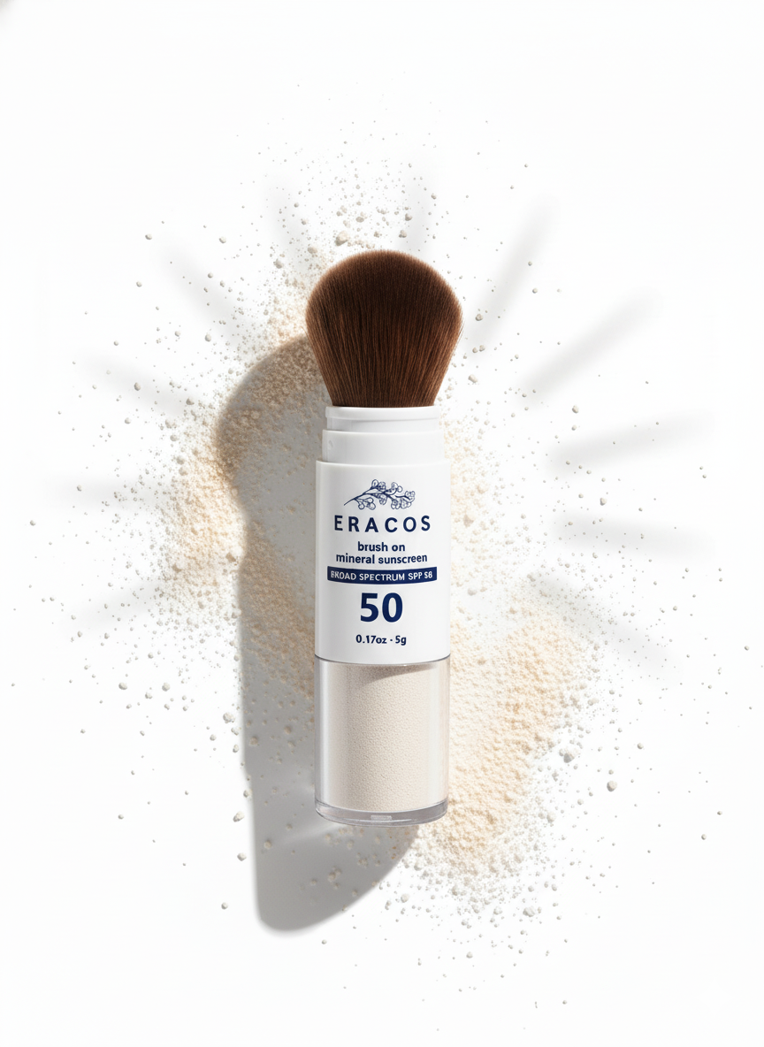 Eracos Sun On Brush-On Sunscreen SPF 50 — a mineral-based, powder sunscreen designed for oily, sensitive, and acne-prone skin. Provides mess-free, on-the-go sun protection that can be applied anytime — even over makeup.