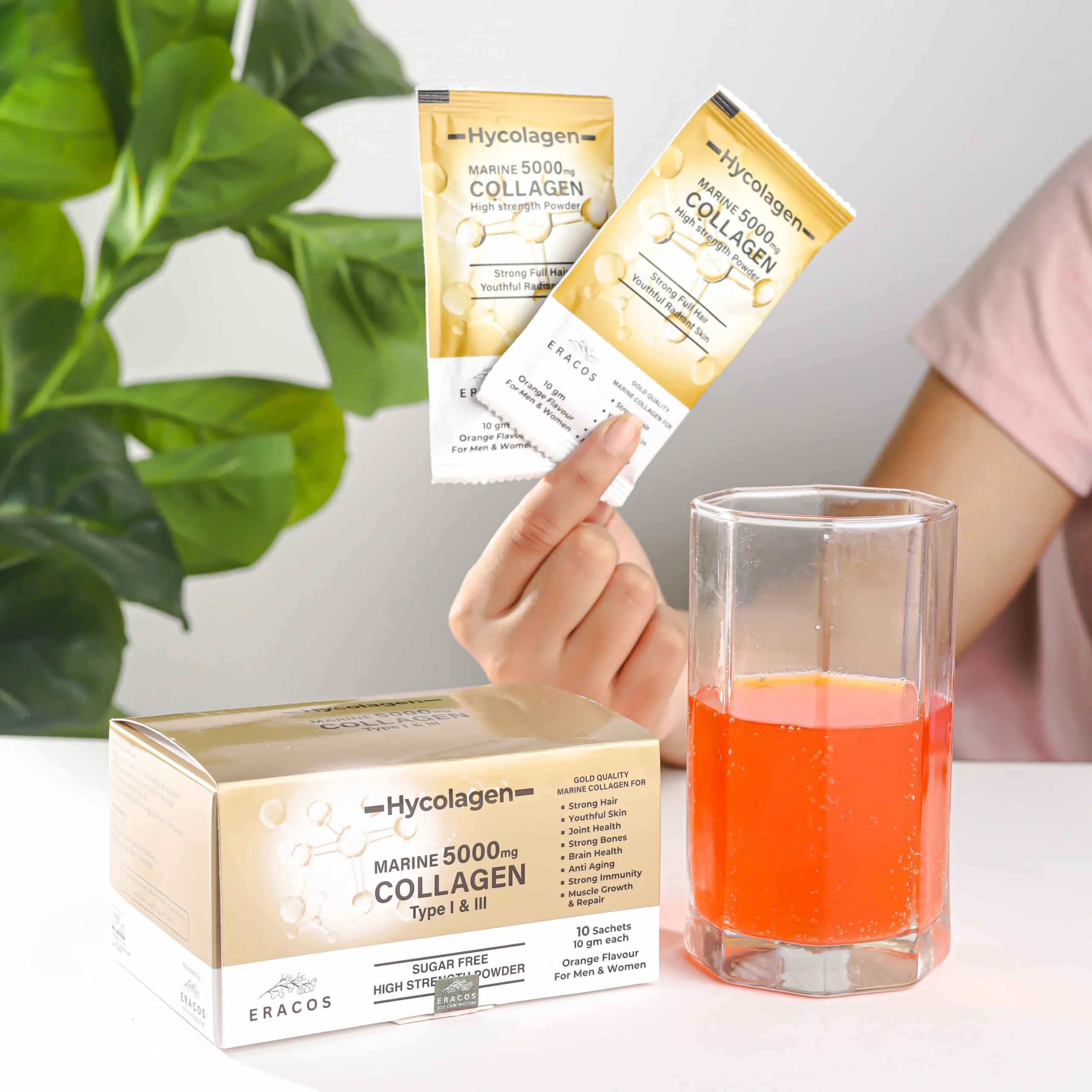 Eracos Hycolagen — a premium high-strength Marine Collagen supplement with 5,000 mg Type 1 & 3 Marine Collagen plus Vitamin C, B-vitamins, Biotin and essential minerals to support skin firmness, hair growth, nail strength, joint flexibility, and bone health from within.
