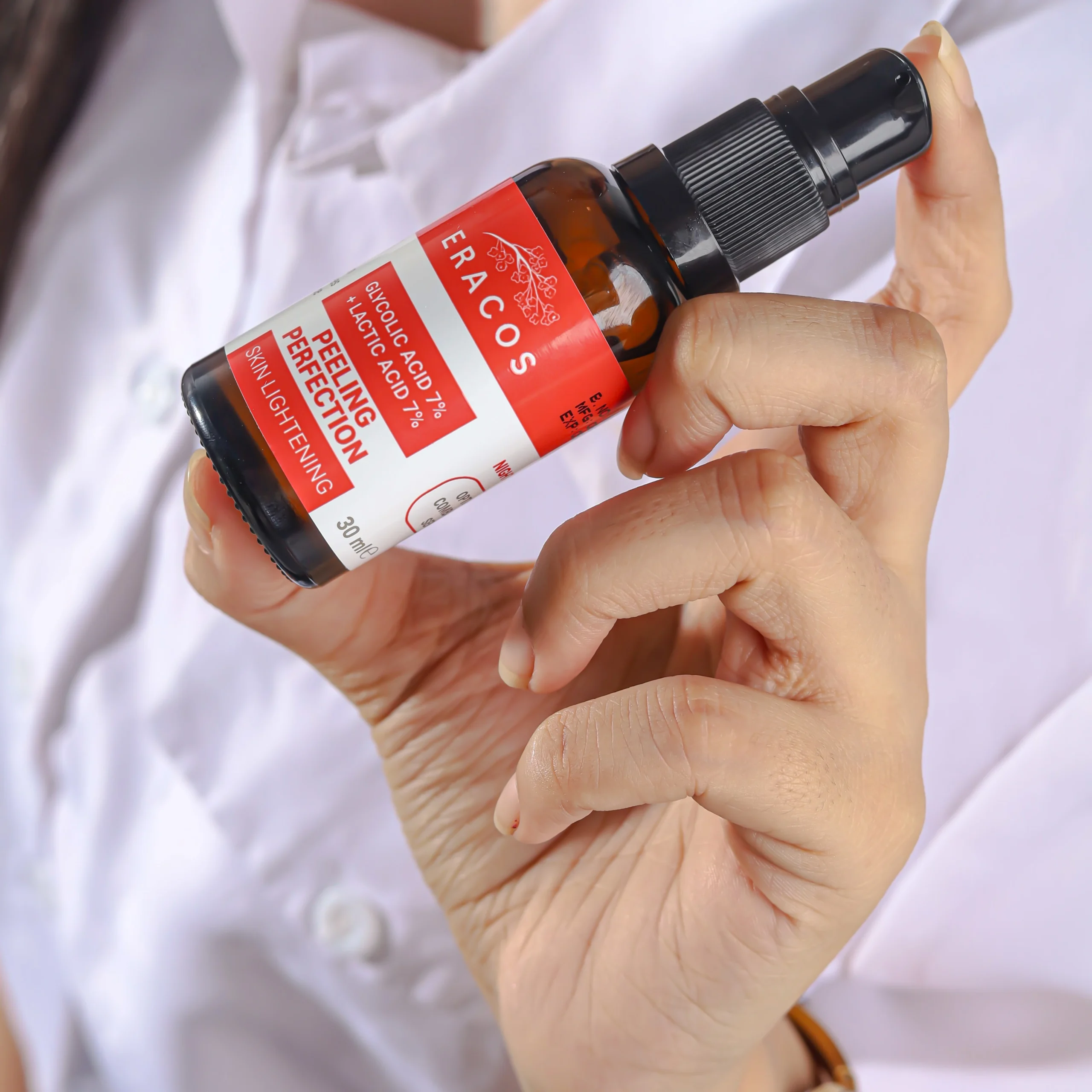 Peeling Perfection Serum (30ml) is a dual-action formula powered by 7% Glycolic Acid and 7% Lactic Acid to exfoliate dull skin, fade dark patches, and deliver a visibly brighter, more even complexion.