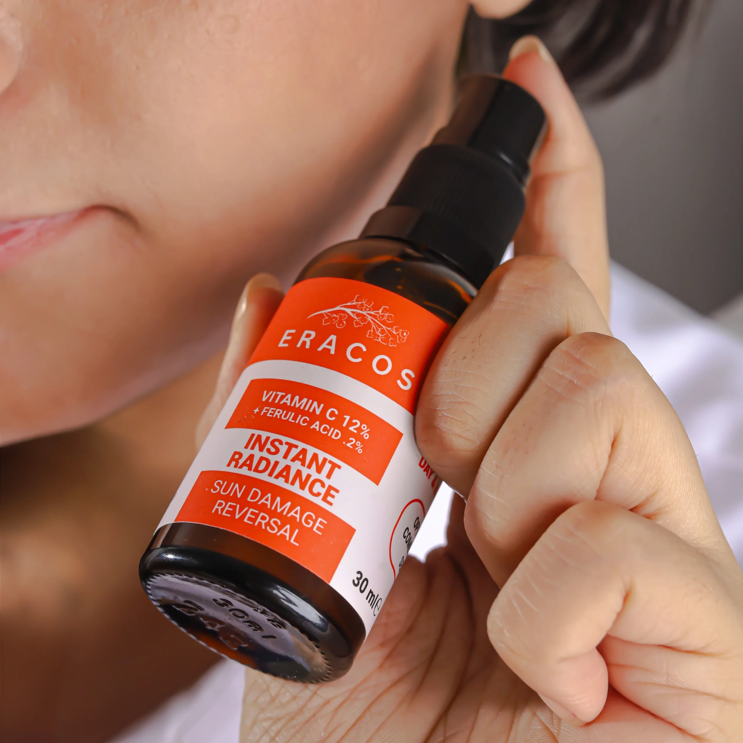 Eracos Sun Damage Serum is a high-strength Vitamin C serum formulated to brighten, protect, and rejuvenate the skin. With 12% Vitamin C, it fades dark spots, boosts glow, and defends against daily environmental damage. Niacinamide and Hyaluronic Acid improve texture and hydration, while Ferulic Acid stabilises and enhances Vitamin C for maximum radiance. With consistent use, skin appears clearer, brighter, and more evenly toned.