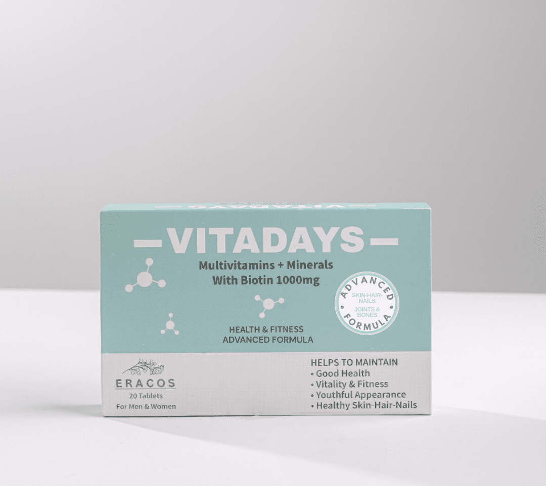 Eracos Vitadays — a comprehensive daily vitamin & mineral formula for men and women, developed to support vitality, healthy aging, immunity, and overall wellbeing. Designed especially for those in mid-life seeking balanced nutrition and everyday energy.